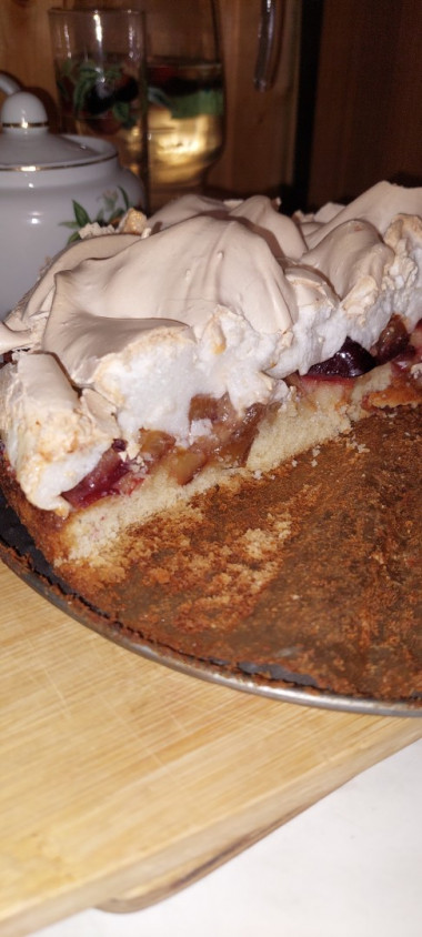 Вот и я приготовила пирог с меренгой, но у меня со сливами. Очень вкусный пирог, особенно верхний воздушный тающий во рту слой с меренгой. Меренгу выкладывала прямо ложкой, получилось тоже красиво. А вообще я думаю его можно приготовить с любыми фруктами и ягодами. Всем понравился.