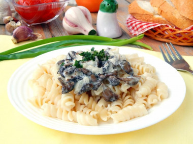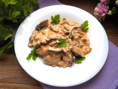 Прогрейте всё вместе еще пару минут и снимите сковороду с огня. Грибы со сметаной готовы! Дополните их любым гарниром и подавайте к столу. Приятного аппетита!