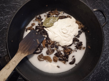 Угостили нас сушеными лесными белыми грибами. Аромат непередаваемый. Решила сделать белые грибы в сметане на сковороде по этому рецепту. Сушеные грибы я сначала замочила, после отварила два раза в кипящей воде. Обжарила лук на сковороде и добавила отваренные белые грибы. Жарила всё вместе до испарения жидкости. Посолила, поперчила и положила лаврушку. Готовила белые грибы с луком до румяности. Затем добавила сметану и тушила минут 15. Потрясающе ароматное блюдо из грибов. Кушали белые грибы в сметане, дополнив макаронами. Это и сытно, и вкусно, и ароматно. Грибочки с луком в сметанном соусе получились мягкими, плотными и сочными. Потрясающе вкусно! Отличный рецепт! Советую всем приготовить! Большое спасибо автору!