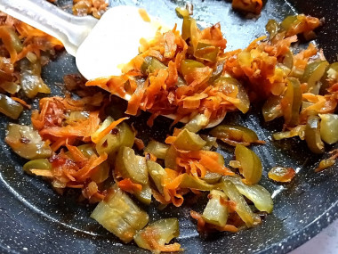 Добавьте морковь, огурцы и томатную пасту. Жарьте, помешивая, около 5 минут.