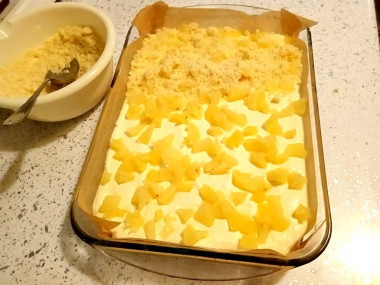 На творог выложите ананасы. У меня были замороженные, с них обязательно нужно слить сок. Можно брать свежие. Сверху выложите штрейзельную крошку.