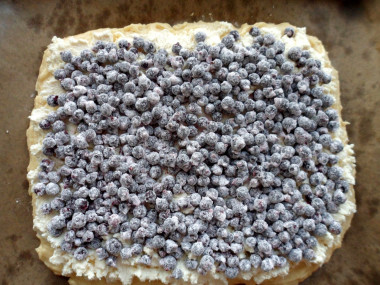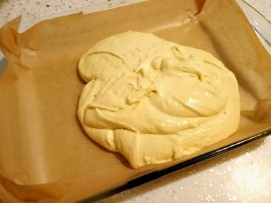 Сразу собираем пирог. Дно формы застелите пергаментом и смажьте сливочным маслом. (Моя форма 20 х 31 см, можно взять чуть больше, но не меньше). Первый слой выложите тесто и разровняйте, можно не особо ровно, в разрезе потом будет даже красивее.
