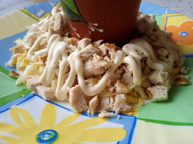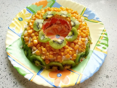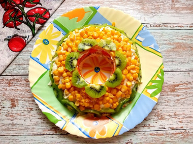Почему бы не сделать праздничный салат просто так на ужин? Захотелось мне чего-то красивого и сытного приготовить. Выбор пал на салат с курицей кукурузой морковью яйцами слоями. Курицу я решила не отваривать, а приготовить на пару в мультиварке, оказало, что это очень легко и не требует постоянного контроля. Вместе с куриным филе приготовилась и морковь. Твёрдый сыр заменила на плавленный, он как раз хорошо натирался на тёрке. При сборке салата стакан поставила на дно, т. к. верх у него широкий. Для удобства майонез переложила в пакет и отрезала кончик. Получилось очень ярко и красиво! Салат вкусный, сытный, немного сладковатый. Киви очень хорошо сочетается со всеми ингредиентами. Рецепт рекомендую и на праздник и просто так!