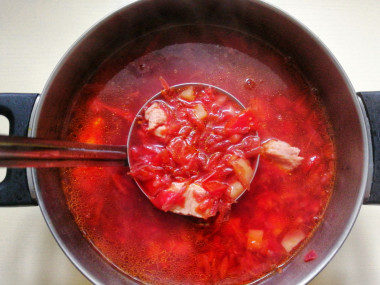 Доведите борщ до кипения и снимите с огня. Кипятить не надо! Иначе борщ потеряет цвет. Дайте борщу постоять под крышкой, хотя бы минут 15-20, чтобы он настоялся. Приятного аппетита!