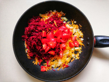 Лук и морковь выложила в сковородку. Пока они жарились, натерла на крупной тёрке свеклу, выложила ее так же в сковородку. Добавила нарезанные помидоры и сахар. Держала овощи на сковороде минут 10, затем влила немного бульона и закрыла крышкой, тушила 10 минут.