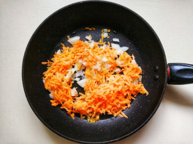 Мелко нарежьте лук, потрите на терке морковь. На горячую сковороду налейте немного растительного масла и выложите морковь с луком. Обжаривайте все вместе 2-3 минуты. Можно сюда же сразу добавить тертую красную свеклу и жарить все вместе. А можно по отдельности.