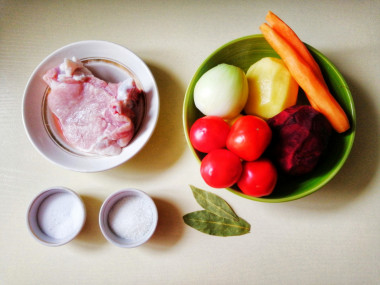 Как сварить борщ со свеклой и свининой? Подготовьте для этого необходимые ингредиенты. Для приготовления борща можно взять любую часть свинины. Я беру свинину на кости, благодаря этому бульон получится наваристый и ароматный. Все овощи заранее очистите от кожуры и ополосните в проточной воде от загрязнений.