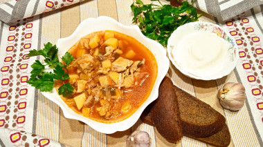 Мясо (у меня была свинина) варила 1,5 часа. Затем добавила в кастрюлю нарезанную картошку, оставила ее вариться на 20 минут.