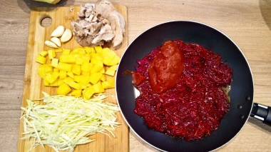 Следом добавьте томатную пасту. Прогрейте свеклу с томатной пастой 2-3 минуты и выложите все в кастрюлю. По вкусу добавьте соль и специи. Добавьте пару зубчиков чеснока, пропущенного через пресс. Для аромата можно добавить лавровый лист.