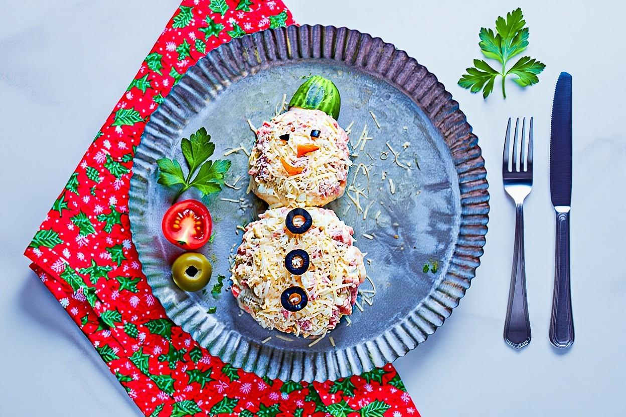 Идея тематических салатов в виде персонажей особенно популярна в скандинавских странах. Салат Снеговик может стать частью традиции — поручите детям каждый год отвечать за его оформление, создавая уникальный семейный ритуал. В разных странах «шляпу» снеговику делают из половинки вареного яйца, кружка сладкого перца или даже из половинки помидора черри.