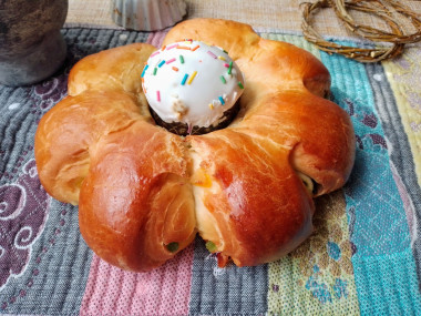 Он очень оригинально смотрится! В центр цветка отлично поместился маленький кулич. Понравилось всей семье, а еще очень удобно отломить себе "лепесток" и съесть его с чаем!