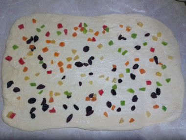 Смажьте тесто сливочным маслом. Выложите равномерно по всей поверхности промытый изюм и цукаты (если они слишком крупные, то их лучше порезать). Присыпьте сахаром и по желанию корицей.