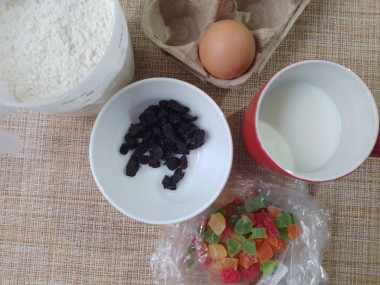 Изюм у меня был сухой, поэтому залила его кипятком минут на 10, а потом обсушила бумажными салфетками. Цукаты нарезала на более маленькие кусочки.