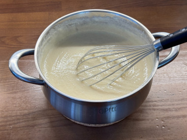 Готовую манную кашу уберите с огня и дайте ей немного остыть. В горячей каше яйца быстро свернуться.