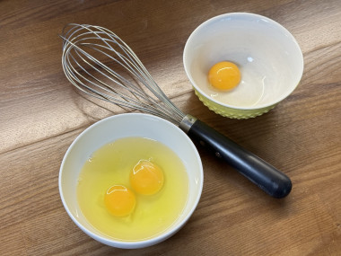 В мисочке взболтайте до однородности целое яйцо и белок от второго. Оставшийся желток оставьте для смазывания пудинга перед выпечкой..