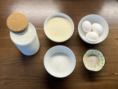 Как сделать манный пудинг как в детском саду в духовке? Для начала подготовьте все ингредиенты. Количество сахара регулируйте по своему вкусу. Можете заменить сахар на любой сахарозаменитель, подходящий для термической обработки. Молоко подойдет любой жирности. Яйца нужны крупные отборные. Если яйца мелкие, можете брать 3 штуки. Чем заменить ванильный сахар читайте в статье по ссылке в конце рецепта под шагами. Заранее включите духовку на 180 градусо