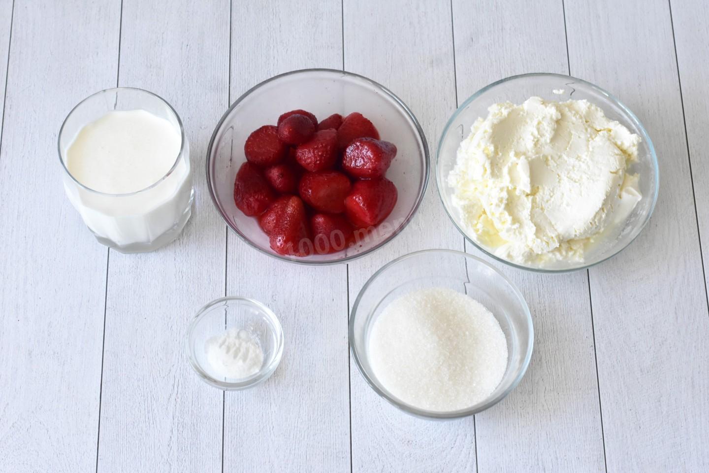 Подготовьте все необходимые ингредиенты. Готовить крем можно из свежей или замороженной клубники. Если клубника замороженная, предварительно разморозьте ее и слейте выделившийся сок.
