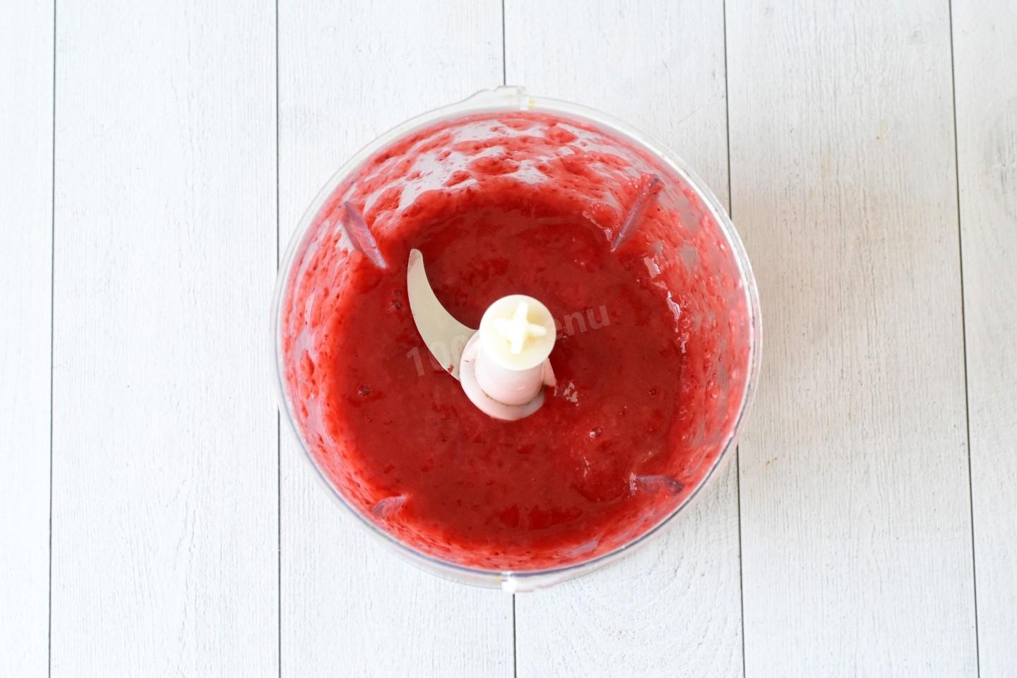 Свежую клубнику промойте, обсушите и удалите хвостики. Взбейте блендером до однородного пюре. Протрите пюре через сито, отсекая косточки. Если пюре очень водянистое, уварите его при постоянном помешивании в сотейнике с толстым дном до густоты и охладите. Добавьте в пюре 1 ст. л. сахара от общего количества и перемешайте.