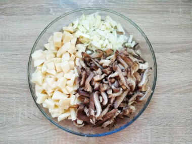 Шляпки грибов нарежьте мелкими или средними кусочками. Репчатый лук нашинкуйте мелко.