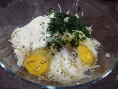 Добавьте в капусту яйца, манную крупу, нарезанный укроп, черный молотый перец и соль.