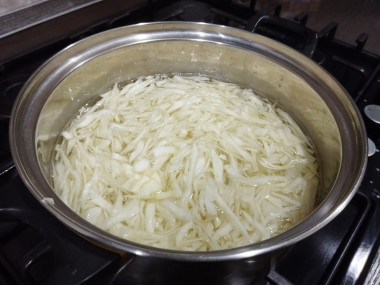 Капусту тонко нашинкуйте. В кастрюле доведите до кипения 2 литра воды, выложите капусту и отварите ее около 15 минут, до полуготовности.