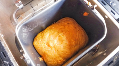 Яйцо использовала категории С1. Тыквенного пюре у меня получилось 220 граммов, добавила его всё в тесто. Муки ушло столько же, сколько указано в рецепте. Тесто получилось по консистенции достаточно густое. Духовка у меня была занята, поэтому выпекала хлеб в хлебопечке 1 час в маленькой чаше.