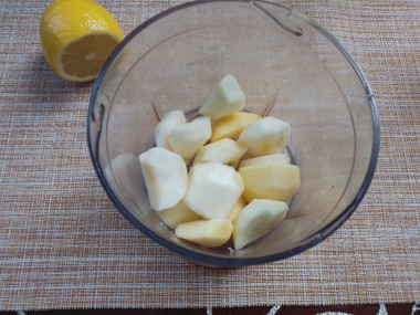 Яблоки очистите от кожуры, удалите сердцевину, нарежьте дольками. Сбрызните дольки яблок лимонным соком, чтобы не потемнели, и перемешайте.
