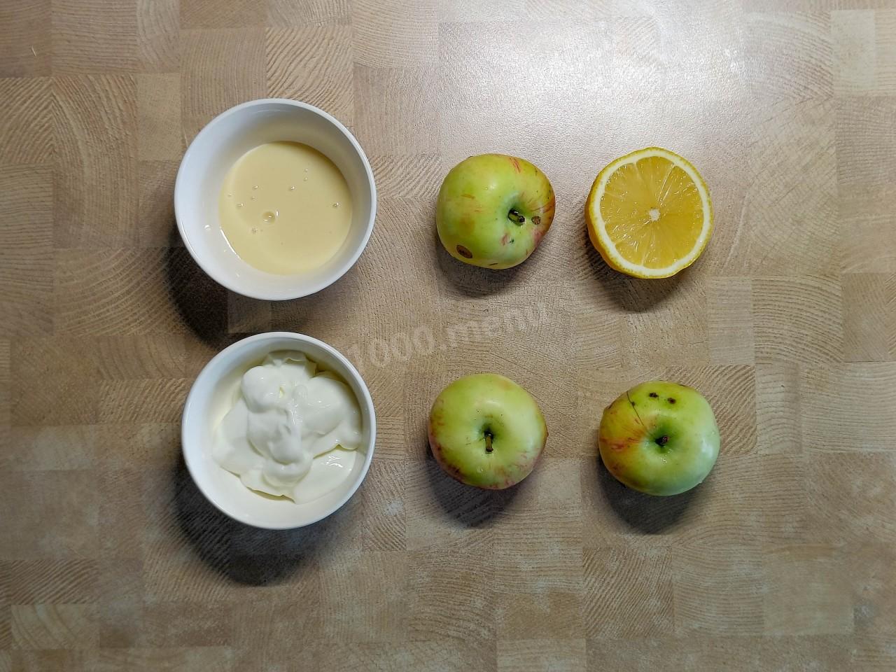 Подготовьте все необходимые ингредиенты. Для десерта лучше использовать сочные кисло-сладкие сорта - симиренко, гренни смит и подобные с ярким выраженным вкусом. Подробную статью про сорта яблок читайте под шагами. Сметану берите жирностью не менее 20%, она лучше держит форму и дает более нежный вкус. Вместо сметаны можно использовать натуральный йогурт без добавок и красителей. А также греческий йогурт или творожный крем.