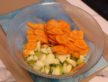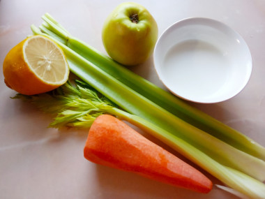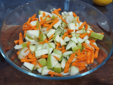 Сложите нарезанные сельдерей, яблоко и морковь в салатник. Обязательно полейте все сверху лимонным соком — он не даст яблоку потемнеть и придаст салату приятную кислинку и аромат. Перемешайте салат. Вы можете заправить его йогуртом и подавать к столу.