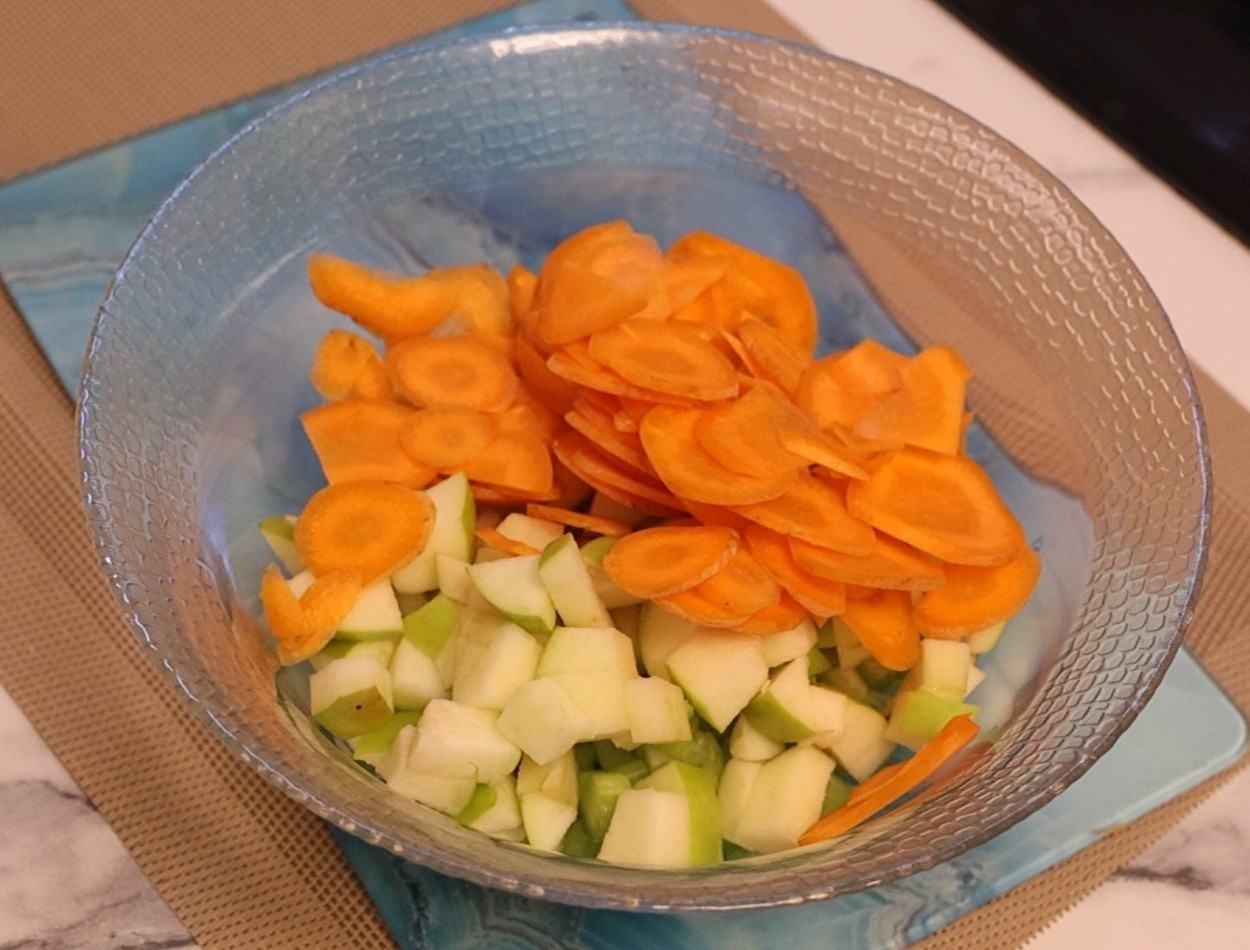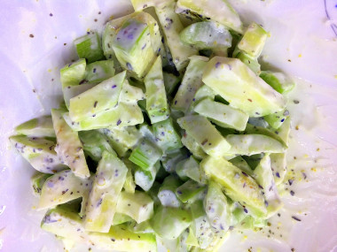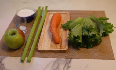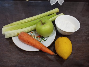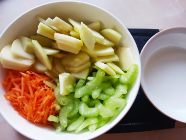 Сельдерей порезала небольшими кусочками, яблоко небольшими дольками, морковь маленькими брусочками. Яблоко не очищала от шкурки. Сбрызнула лимонным соком и вместо йогурта добавила сметану 15%. И ещё добавила чуть -чуть зелени укропа. Перемешала.