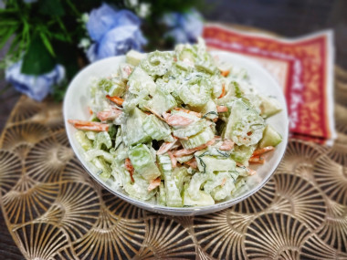 Я подавала салат, выложив его на микс из салатных листьев. А заправку из йогурта поставила на стол отдельно. Приятного аппетита!