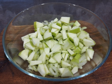 Яблоко хорошо помойте, разрежьте на четвертинки и удалите сердцевину с семенами. Нарежьте четвертинки небольшими дольками. Если шкурка у яблока очень жесткая, то срежьте ее. Также вы можете нарезать яблоко соломкой или кубиками.