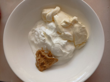 В отдельной небольшой емкости соедините сметану с майонезом и горчицей. Сметану можно заменить густым натуральным йогуртом без добавок.