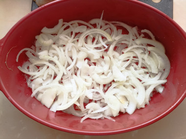 Слегка смажьте жаропрочную форму рафинированным растительным маслом с высокой температурой дымления. Выложите луковые полукольца.