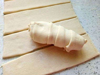 Слоёное тесто немножко раскатайте скалкой. Разрежьте пласт теста на полоски шириной 5-7 см.
