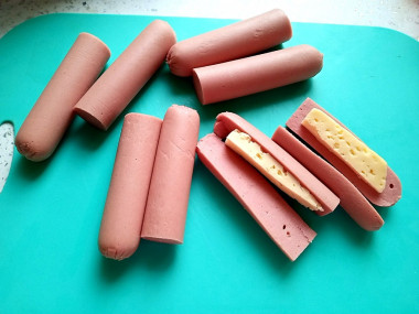 Сыр нарежьте тонкими узкими полосками, равными по длине сосискам.