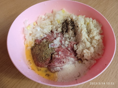 Всю массу хорошо перемешайте до однородного состояния. Отбейте все о дно чаши. Как это сделать? Руками поднимайте котлетную массу и бросайте в чашу. Фарш станет плотнее и котлеты при жарке не будут разваливаться. Дайте фаршу постоять минут 10-15, чтобы манка начала впитывать в себя влагу.