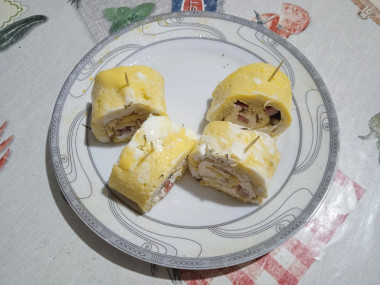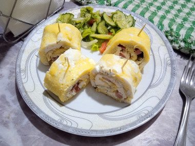 Приготовила рулетики из омлета с начинкой по этому рецепту на завтрак. Приготовила сначала яичный блин из яиц. Обжарила до готовности и остудила. Для начинки выбрала плавленый сыр с грибным вкусом. Использовала измельчённую зелень укропа. От себя ещё добавила в начинку немного колбаски, порезав соломкой. Теплый омлет смазала натертым сыром, посыпала зеленью, уложила колбаску и без проблем завернула рулетом. Порезала на кусочки шириной 3 см и воткнула зубочистки. К сожалению, оливок у меня не оказалось под рукой для украшения. Подавала рулетики из омлета с начинкой на завтрак со свежим овощным салатом. Прекрасный вышел завтрак. И красиво, и аппетитно, и сытно, и очень вкусно. Обязательно повторю оригинальный завтрак, который готовить проще простого. Вроде обычный яичный блин, а в виде рулетиков с начинкой выглядит очень эффектно и празднично. Всем рекомендую! Отличный рецепт! Большое спасибо автору!