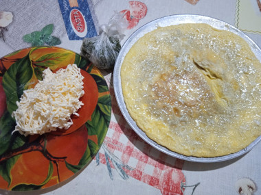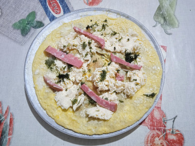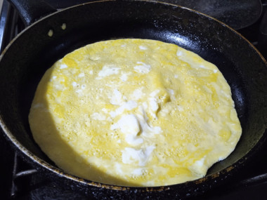 2. В сковороду с антипригарным покрытием (можно для этих целей взять блинную сковороду) налить немного оливкового масла, прогреть его. Аккуратно вылить половину яичной смеси, поворачивая сковороду из стороны в сторону так, чтобы покрыть все дно посуды. Обжарить яичный блинчик с одной стороны в течение 2 минут и аккуратно, поддев лопаткой, перевернуть его на другую сторону. Обжарить омлет с другой стороны и выложить его на тарелку. То же самое проделать со второй половиной яичной смеси. Таким образом, должно получится два одинаковых омлета. Выложить их на тарелки и дать им остыть.