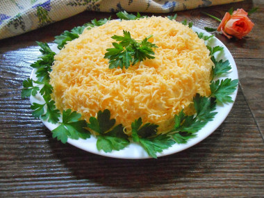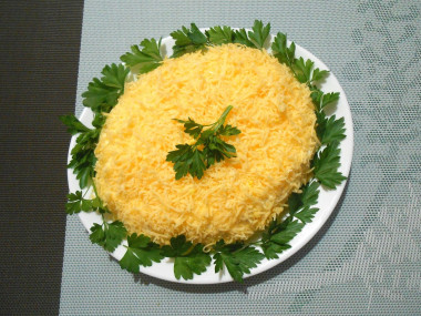 Завершающим слоем салата на мелкой терке натираем твердый сыр.