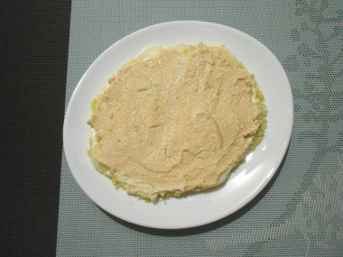 Далее приступаем непосредственно к сборке салата. Берем большую тарелку и на дно первым слоем на крупной терке натираем отварной картофель. С помощью ложки или кухонной лопатки разравниваем слой.