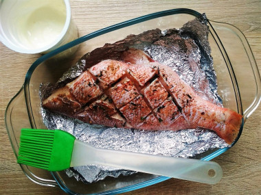 6. Форму для запекания смазать оливковым маслом и выложить в нее замаринованную рыбу. Сверху каждую тушку окуня смазать сметаной.