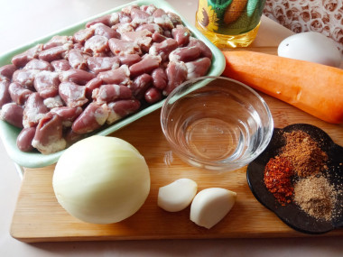 Процесс приготовления этого вкусного салата в азиатском стиле не сложный. в первую очередь подготавливаем необходимые продукты. Начинаем с куриных сердечек, которые нужно хорошо промыть под проточной водой, затем переложить их в небольшую кастрюлю, залить водой так, чтобы она полностью покрывала сердечки, слегка ее подсолить. Варим сердечки до готовности, накрыв кастрюлю крышкой. По времени это занимает 35-40 минут. После бульон сливаем, а сердечки выкладываем на широкое плоское блюдо до полного остывания.
