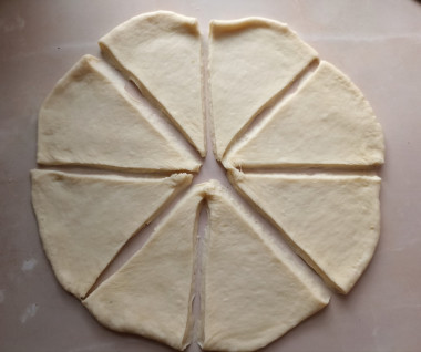 Тесто обминаем, выкладываем на стол, присыпанный мукой. Делим на 3 части. Каждую часть раскатываем в круг, разрезаем круг на 6 сегментов.