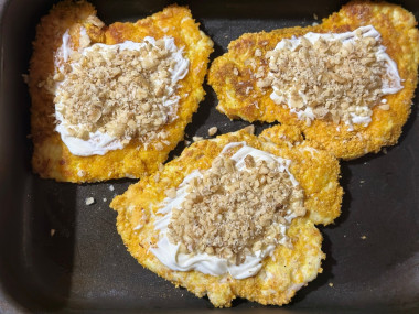 Ммммм вкусно! Интересный вариант второго блюда из курицы, которым можно удивить ценителей мяса. Филе курицы я прорезала вдоль, слегка отбила. У меня панировочные сухари достаточно крупной фракции, покупные, я добавила к ним еще куркуму и гарам масалу. Жарила частями, не уместились все сразу отбивные. Орехи использовала грецкие и не сметану, а легкий майонез. Также на не промазанные майонезом места положила по кусочку сливочного масла. Поставила на 15 противень в газовую духовку, накрытый фольгой. По истечении 15 минут, фольгу приоткрыла, газ выключила и оставила просто я духовке минут на 15 еще. Ну очень ярко, вкусно! Спасибо большое за рецепт