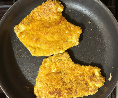 В сковороде на среднем огне разогрейте растительное мало. Выложите курицу в панировке и обжарьте примерно по 3-5 минут с каждой стороны до золотистой корочки. О том, как подобрать идеальную сковороду, а также как правильно выбрать масло, читайте в отдельных статьях, ссылки в конце рецепта.Шаг 8: