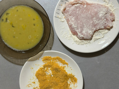Каждый ломтик курицы обваляйте в муке, затем обмакните во взбитые яйца и запанируйте в сухарях. Панировочные сухари можете взять готовые магазинные или сделать такие самостоятельно из подсушенного и измельченного белого хлеба.Шаг 7: