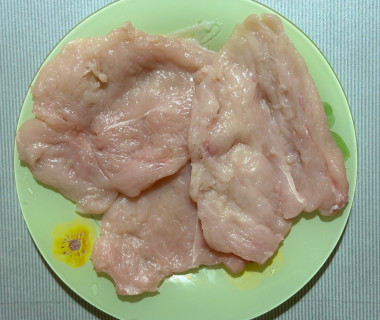 Куриное филе вымойте, обсушите. Каждое филе разрежьте вдоль на 2-3 части в зависимости от размера филе. Ломтики курицы накройте пищевой пленкой и слегка отбейте молоточком. Курицу посолите и поперчите.Шаг 3: