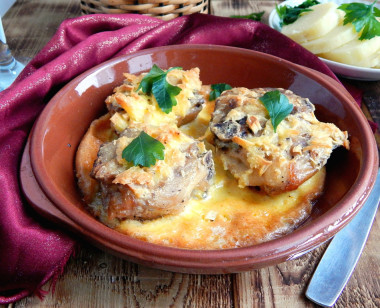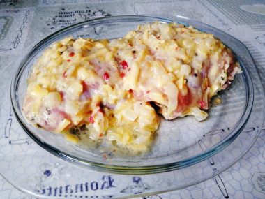 Взяла два куриных окорочка. В большой тарелке взбила яйцо, добавила немного соли, тертый сыр, от себя добавила ещё жареный лук. Орехов меня не было.