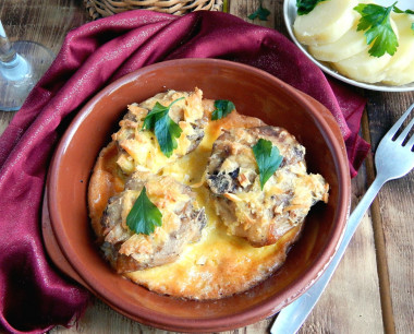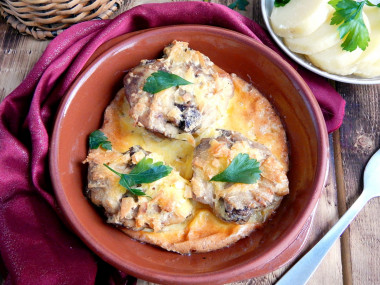 Окорочка обваляла в муке, а затем в кляре. Выложила в смазанную форму и, закрыв фольгой, отправила в духовку.